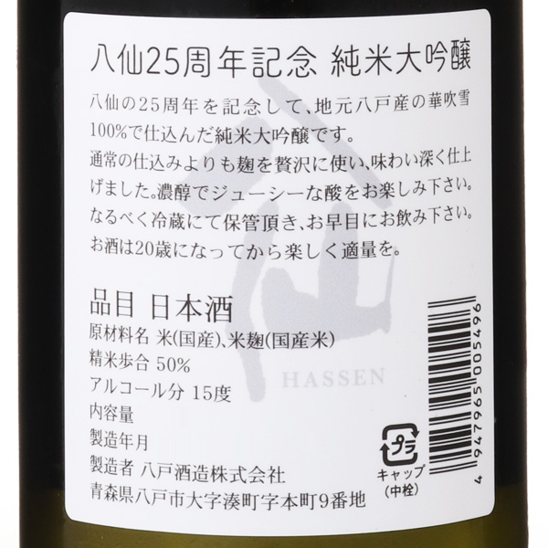 1998年に設立した「八仙ブランド」は今年で25周年を迎えます。日頃の感謝を込めて、八戸産の華吹雪を100%使い、50%まで磨き上げ醸した記念酒をリリースします。香り華やかで口に含むとお米由来の甘みや旨味が口中に広がります。しっかり冷蔵庫で冷やしてから、室温に30分程戻して口の広い器やグラスでお楽しみください。蔵紹介