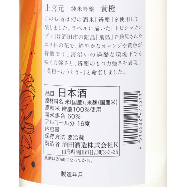 幻の酒米「辨慶(べんけい)」を使用して醸しました。穏やかな香りと爽やかに広がる旨味が特徴です。すっきりとした後口ですので、まだまだ続く暑い日も爽やかに演出します。ラベルには酒田市の離島「飛鳥」で発見されたユリ科の花「トビシマカンゾウ」が描かれています。鮮やかなオレンジや黄色が特徴で、海沿いの過酷な環境下でも咲く力強さと、辨慶のもつ力強さを表現し、黄橙(おうとう)と命名しました。