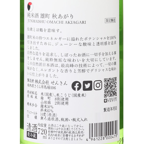 岡山県産 備前雄町で醸した数量限定の秋あがりです。低温発酵でアルコール度数14度に抑える事で爽やかな酸味を引き出しながら、雄町ならではのボディー感とジューシーな酸味、透明感を追求しました。一切の雑味が無く、エレガントな香りと芳醇でデリシャスな味わいをお楽しみください。蔵紹介