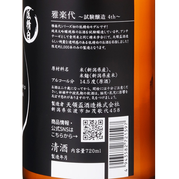 雅楽代シリーズ試験醸造第四弾はシリーズ初の低精白モデルです。精米歩合非公開ですが、食用米のコイン精米を使用してますので、ほぼ公開しているようなものです。低精米由来の油分、糠感、栄養素たっぷりの醸造での醪コントロールなど、いくつものチャレンジに向き合いました。仕上がりは口の含むと、綺麗な甘みとともに、雅楽代には珍しい酸味を感じます。後味は雅楽代らしく、綺麗にフェードアウト。冷蔵庫から出してすぐ〜常温付近が飲み頃となっています。普段の雅楽代シリーズとはかけ離れたコンセプトではありますが、低精白のお酒としては仕上がりよく、蔵元としても合格ラインとお墨付きです。蔵紹介