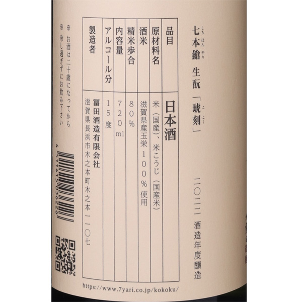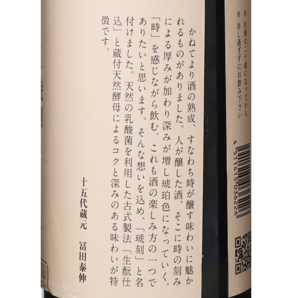 日本酒もワインやウイスキーの様に、熟成によって味わいに厚みが加わり深みが増していきますが、その魅力はまだあまり知られていません。この琥刻は、改めて日本酒における「時」を味わう愉しみを提案したお酒です。琥刻(ここく)という名前は、湖国滋賀の地で醸した酒が、時を刻み琥珀色に変化する様子をイメージしています。生もと、低精白、酵母無添加、それぞれの特徴が絡み合い、味わいがしっかりありながらも、抜けのあるキレの良さが特徴です。お好みで、あらゆる温度帯でお楽しみください。