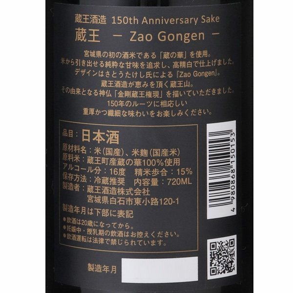 創業150周年を記念して2種類のお酒をリリースします。Zao Gongenは地元蔵王町産の蔵の華を150にちなみ「15%まで磨いた」高精白日本酒です。香りは穏やかな果実様、口に含むと優しい甘味が入り込んで、そのまま体に馴染んでいきます。ピュアという言葉が良く似合う最高級な日本酒に仕上がりました。デザイン原画は地元出身のローラーペイントアーティストのさとうたけし氏。蔵王酒造のルーツとなる蔵王権現を描いていただきました。注意事項
