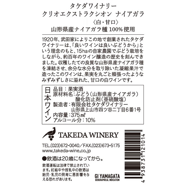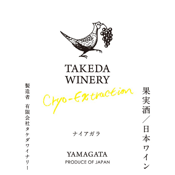 良質な山形県産ナイアガラ種を100%使用しています。この品種は山形県で広く栽培されており、生食用として昔から親しまれています。果肉が柔らかくジューシーで、甘みと芳香が強い品種です。このワインは、いったんぶどうを凍らせ先に溶け出す甘い凝縮した果汁だけを集めて醸造した、ナイアガラの果実感溢れる若々しい白ワインです。すっきりとした甘さに、酸味も穏やかでバランスが良く、アペリティフやデザートワインに最適です。5℃から10℃くらいに冷やしてお愉しみください。