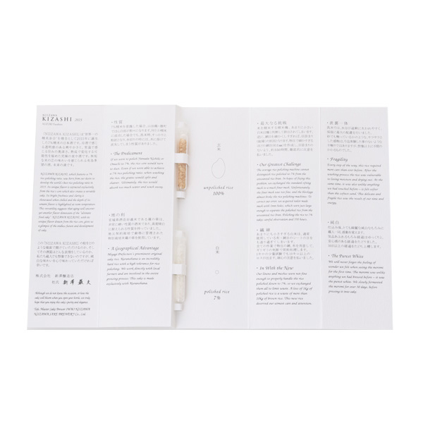 現代アートとのコラボレーション日本酒として2015年に発売。以来、毎年様々なアーティストとのコラボレーションしています。高度精米になると麹の製造が極端に難しくなり、麹由来の旨味を引き出しにくくなるのですが、KIZASHIについては、同じ7%精米である『残響Super7』の1.5倍程度の米の旨味を引き出すことに成功した、技術溢れる1本となっています。『NIIZAWA 純米大吟醸』と『残響Super7』の間の糖度で仕上げており、若さを感じる酒質です。冷蔵庫で保管することにより、綺麗に熟成していきます。年間1000本限定の貴重な1本です。2023年ラベルエチケット :鈴木 康広(Yasuhiro Suzuki)