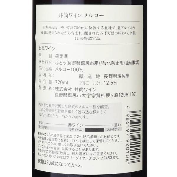 優しくふくよかな果実味がタンニン分などの骨格を包み込む様にして広がる柔らかい呑み口です。GIとは「酒類の地理的表示制度」で「Geographical Indication」の略です。これまで「長野県原産地呼称管理制度(通称NAC)」を導入していましたが、2021年に新たにその考え方や手法を引き継いだのが「GI長野」。ワインの場合、長野県でとれた葡萄を使い、醸造、瓶詰され、さらに厳しい官能審査(色・香り・味・バランス)などに合格したものだけが認定されます。