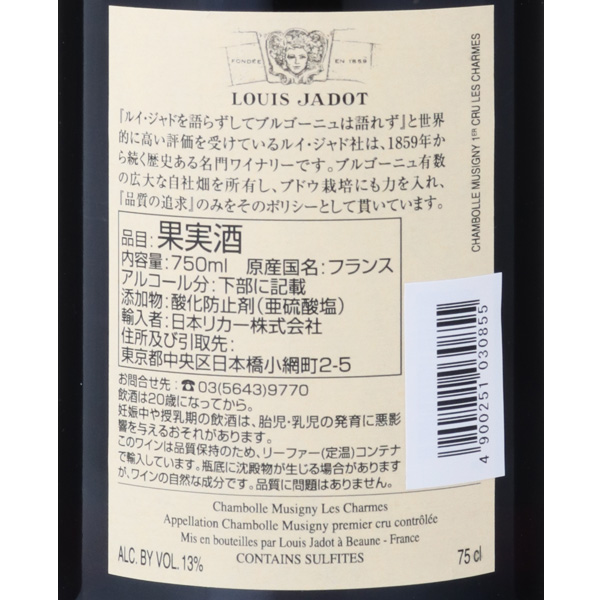 「レ・シャルム」の区画は、特級畑であるボンヌマールとミュジニーに挟まれたシャンボール・ミュジニーの中央に位置する一級畑の一つです。深く美しい色合い、赤系ベリーの香り高く芳醇なアロマと複雑みのある香りが特徴です。シャンボール・ミュジニーの石灰質が中心となる土壌はコート・ド・ニュイ地区の中でもユニークなエリアで、シルクのようになめらかな味わいに表現されます。ルイ・ジャドのシャンボール・ミュジニーは、香り高く芳醇でしっかりとしたコクと柔らかなテクスチャーが共鳴するエレガントな味わいです。