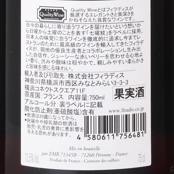 日々の暮らしに寄り添うワインを届けたいという想いから日曜から土曜のことを表す「七曜紋」をラベルに採用。日本人の味覚に合うワインを徹底的に追求し、今までレストランのために最高級のワインを輸入してきたフィラディスが、現地の優良生産者とコラボレーションし生み出した自信作です。ジューシーな赤いベリーを思わせる心地よい香り。渋みや酸味は穏やかで、親しみやすい柔らかさと旨味を感じる味わいです。【おすすめ料理】豚肉のソテー、焼き鳥(塩)、赤身魚のお刺身、フレッシュなトマトソースパスタ