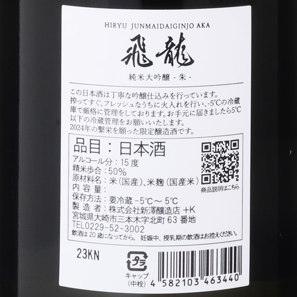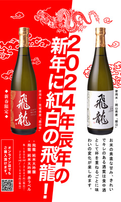 飛龍から来年の辰年をお祝いすべく、おめでたい赤ラベル限定リリース!通常の白ラベルは朝日米を使用していますが、赤ラベルは蔵の華を使用しています。上品で軽快な口当たり、ほんのり甘く、優しい旨味が広がります。穏やかでまとまりのある余韻を感じます。おめでたい宴席にも寄り添う究極の食中酒としてお楽しみください。