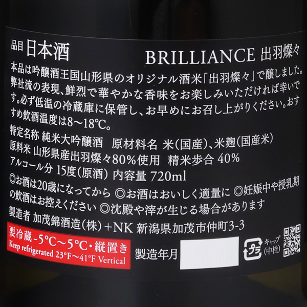 高品質で高精白米を追及するBRILLANCEシリーズ。吟醸酒王国山形県のオリジナル酒米 出羽燦々で醸しました。加茂錦流の表現、鮮烈で華やかな香味をお楽しみください。蔵紹介