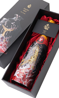 パッケージは毎年多彩なアーティストの方々とのコラボレーションにより新たなデザインを採用しています。本年のデザインは、石川県能美市に工房を構える陶芸家、牟田陽日(むたようか)氏とのコラボレーションです。牟田氏が造る作品は、伝統の陶芸の世界に革新をもたらす作風で知られておりますが、今回はDAITOのコンセプトに合わせて造った大徳利をベースにパッケージを制作しました。