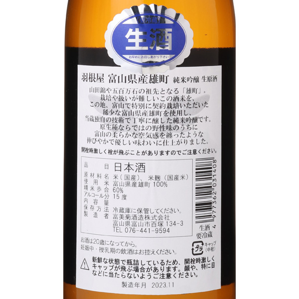 羽根屋 純米吟醸 富山県産雄町 生原酒
