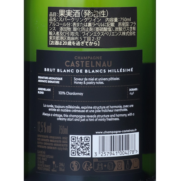 カステルノーの所有畑をもってすれば、当然コート・デ・ブランのシャルドネだけで造ることもできますが、 敢えてモンターニュ・ドゥ・ランスのシャルドネも絶妙なバランスでブレンドすることにセラーマスターの意図が感じられます。10 年を超える瓶内熟成を経たその味わいは、繊細さと力強さの双方を備えています。クリーミーで繊細な泡とわずかにミントのような爽やかでフレッシュな香りが第一印象にあり、ハチミツや ブリオッシュといった深みのあるリッチな味わいがゆっくりとエレガントに広がります。ほのかなトースト香やモカのニュアンスは香りや味わいに複雑さを与え、シャルドネ特有の豊かな酸はフレッシュさを保つだけではなく、同時にワインに心地よい緊張感をもたらしています。