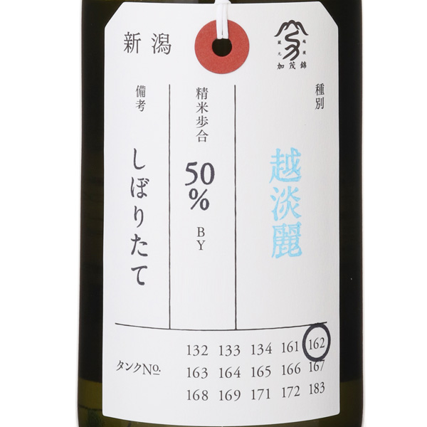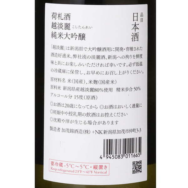 「荷札酒」シリーズは、時期やロットによって使用する酒米や製造方法などを変え、それを荷札に表記して販売される人気商品です。新潟県で大吟醸酒用に開発・育種された酒造好適米 越淡麗 を使用しています。越淡麗由来の硬質感のあるクリアな香味、加茂錦流の淡麗酒、新潟への拘りを鮮度味と共にお楽しみください。注意事項