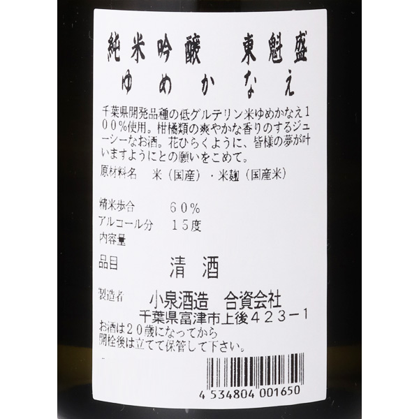 千葉県開発品種の低グルテリン米(消化性タンパク質の含量が低い米) ゆめかなえを使用した純米吟醸です。柑橘類の爽やかな香りのするジューシーなお酒で、程よい甘味と、キリっとした軽快な酸が特徴的。米の多様な可能性を引き出して醸していきたいという小泉酒造の夢の1つをモチーフに醸しました。よく冷やして開栓後はお早めにお召し上がりください。蔵紹介