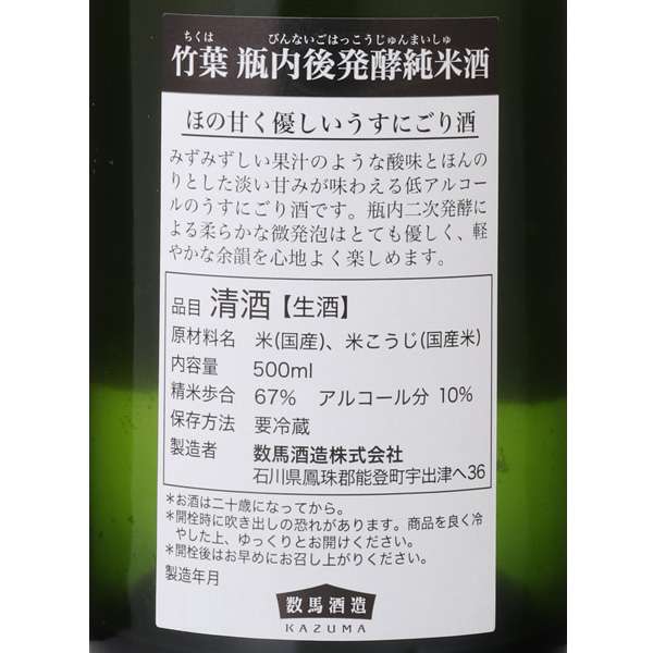 能登産米で醸した低アルコールのうすにごり酒、微発泡のスパークリング酒です。瑞々しいリンゴの様な酸味とほんのりとした淡い甘味、柔らかなガス感は優しく、軽快な余韻をお楽しみ頂けます。*開栓時に吹き出しの恐れがあります。よく冷やしていただき、ゆっくりと中のガスを抜くように開栓してください。