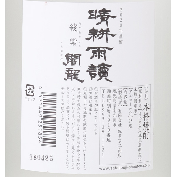 晴耕雨讀 闇龍(くらおかみ)綾紫 芋焼酎 25度 / 佐多宗二商店