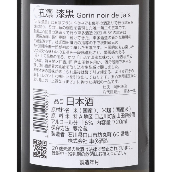 「五凛 漆黒」は五凛ブランドの中でも毎年の酒造りで行う試みを世に問う、その年毎の個性を表現した唯一無二の五凛です。創業二百回目の酒造りで行う車多酒造2023年BYの試みは山廃系酒母に長年挑戦し続けてきた、車多酒造の新たな挑戦の生?生酒です。杜氏 岡田謙治氏の指導の下で次期蔵元の九代目 車多慶一郎氏が初めて醸した五凛です。日常的にもお楽しみいただける味わいの五凛を一段階進化させ、緊張感のある「凛として品格のある」かつ「上品で濃密な味わい」を表現するために、特A地区口吉川町産山田錦を用い、酒母段階でお米を擦り潰し自然界の乳酸を取り込む生もと系で醸しました。