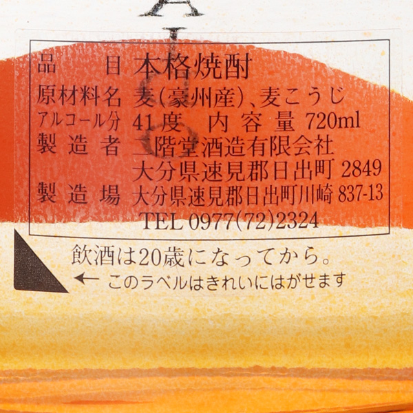 麦と麦麹だけで造る「大分むぎ焼酎 二階堂」のプレミアムライン、総生産数わずか600本の超希少な麦焼酎。このプレミアムラインの商品は、限られた特約店のみの超限定品です。最大の特徴は41度のアルコール度数。高アルコール度数の中に麦本来の香り、甘味、旨味が感じられ、力強さとスムーズな飲み心地を実現しました。製造過程においても、減圧蒸留と2段仕込の方法が採用されており、1年間ステンレスでの貯蔵を経て、その味わいをさらに深めています。