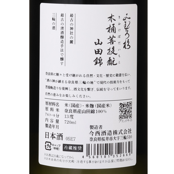 「文化・歴史・土壌・手仕事」に拘り醸し、みむろ杉の哲学を最も表現した木桶菩提もと。奈良県三輪のに脈々と受け継がれる時・歴史・文化の延長線上に存在するお酒として、新たな菩提もとを表現しています。奈良県産の山田錦を使用。アルコール度数は13度と抑えめにする事により木桶自体の味わいの要素が加わり、追求されたクリアで滑らかな飲み口に加え、そやし水(乳酸発酵水)由来の力強さと厚みのある味わい、そして木桶に棲みつく微生物が生み出す複雑味と香り、一見相反する要素が酒の神が宿る三輪の仕込み水の力で、絶妙な調和を醸しています。上立香は穏やかなメロン・バナナ様の香り。口に含むと軽やかなタッチと主張し過ぎない清涼感ある杉の香り、適度に凝縮された米の旨味と木桶由来のタンニン感、きめ細やかな渋み、重層的で深みのある味わいは、力強くも心地よい酸味と共に長い余韻を演出してくれます。