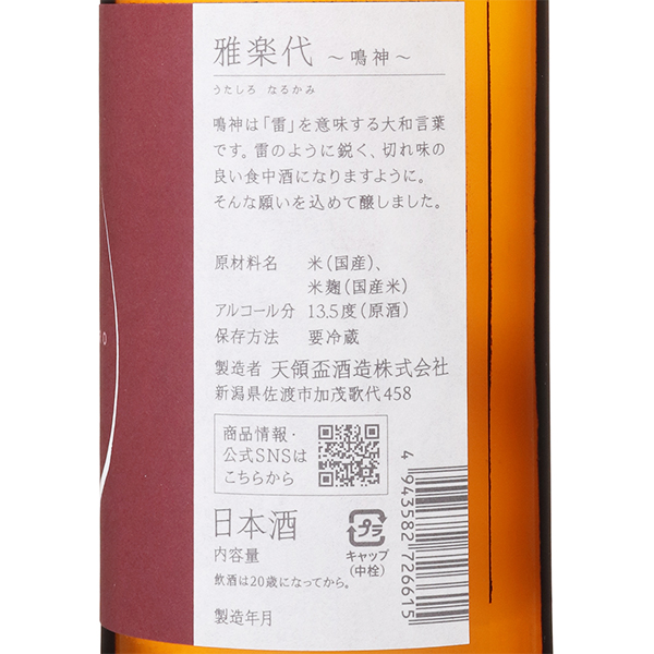 超辛タイプの雅楽代。雷、雷神を意味する大和言葉の鳴神(なるかみ)と名づけられました。超辛のスパッとしたキレと稲妻のようなシャープなキレをかけています。今までの雅楽代に比べると香りは控えめ、上立香は清涼感のある、ラムネの様な香り。口に入れるとほのかな甘み。その後からキュッと引き締めてくれる酸。余韻なくスムーズにキレていく後味。鳴神の特徴であり個性となります。直接的な甘さを出さずに、口の中でじんわり膨らむ自然な甘味をお楽しみください。#はせがわ酒店スタッフの、私これ買いました!