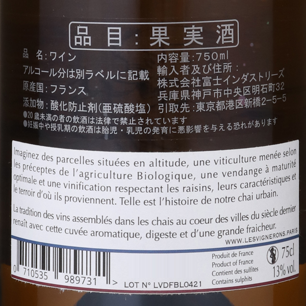 コート・デュ・ローヌの契約農家のブドウを使用。全房のままプレス。ステンレスタンクでデブルバージュ後に発酵。そのまま良質の澱と共に熟成。果実の純粋な味わい、フレッシュさを保つ為に、バトナージュは行いません。カジュアルな味わいで、夏に冷やして飲むのもおススメです。日本限定のこちらのラベルには、おつかいで買ったフランスパンを片手に街を駆け回る“パリの男の子”の可愛らしいイラストが描かれています。これは50年代のパリで撮影された写真をもとに、イラストレーターに描いて貰ったものです。1950・60年代には、パリ南東部のBercy(ベルシー)地区に醸造所があり、セーヌ川から運んできた樽ワインをブレンドして、瓶詰後に販売していたそうです。その後、パリの醸造所は姿を消してしまいましたが、半世紀の時を経てレ・ヴィニュロン・パリジャンが、再びパリでワインを造り始めました。彼らはその古き良き時代へのオマージュの意味も含めてこのラベルを採用しました。