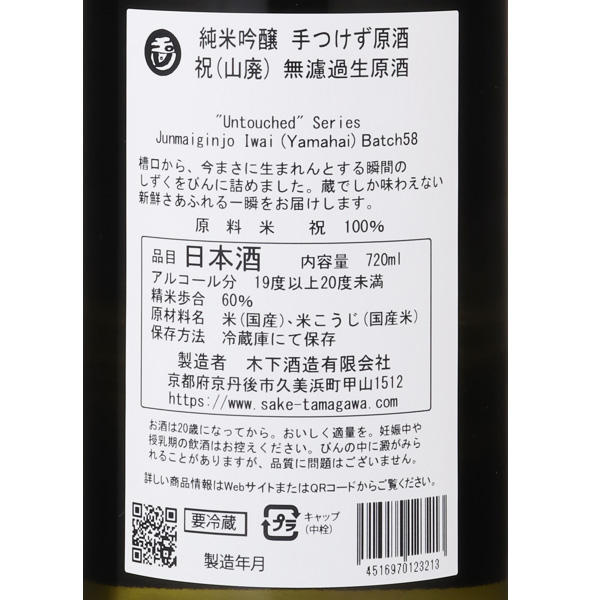本来、蔵人にしか味わえない一瞬を日本酒ファンにお届けする「手つけず原酒」シリーズ。今回は京都府産 酒造好適米「祝」を使用し、通常の手つけずは速醸仕込みですが、こちらは山廃仕込みで行いました。しぼりたてのフレッシュ感と、山廃ならではの芳醇でボリュームのある旨味をご堪能下さい。淡麗な味と独特の芳香、お米由来の優しい甘味としっかりとした旨味が特徴的。発酵中に発生する炭酸ガスは、搾った瞬間から逃げて行きます。このガスを逃がさないよう、直接搾り機の出口で酒を手詰めし、その瞬間に打栓。瓶詰め後の二次発酵で生まれる炭酸ガスではなく、本発酵の炭酸ガスを楽しめる、珍しい限定シリーズです。炭酸の刺激が爽やかなパンチを感じさせる無ろか生原酒「手つけず原酒」は、食前酒に最適です。
