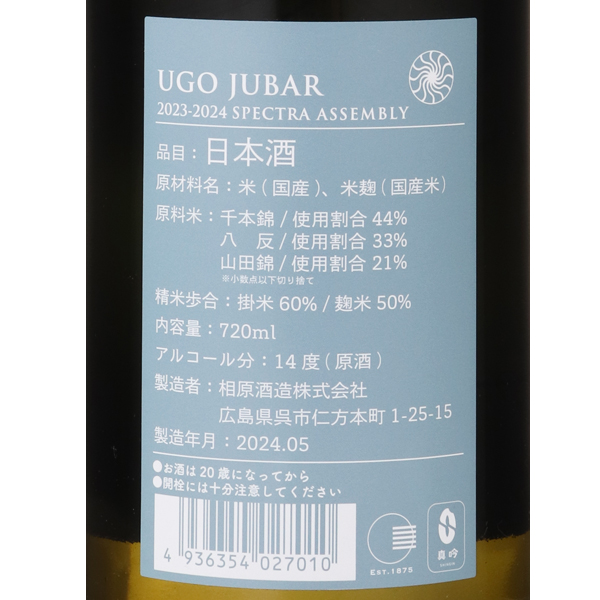 今まで培った技術に新たな感性を加え、より自由な感性でこれからの吟味を追求するUGOシリーズ。「太陽の輝き・陽光」を意味するJUBAR。ややとろみのある滑らかなテクスチャとともにデラウェア・梨瓜・ほのかに紅茶の穏やかな香り。追いかけるよう拡がる柑橘様の酸味と渋味がアクセント、太陽の恵みを凝縮したような味わいに仕上がっています。蔵紹介