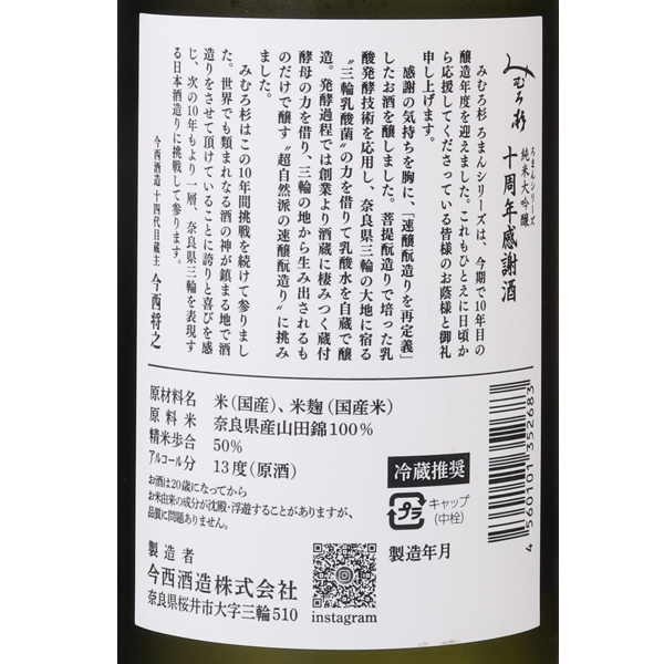 みむろ杉 ろまんリシーズを醸しはじめ今期で10周年。この10年間様々な挑戦をし続けてきました。次の10年も世界でも類まれな酒の神が鎮まる地で酒造りをさせて頂けていることに誇りと喜びを感じ、より一層奈良県三輪を表現する日本酒造りに挑戦して参ります。 (今西社長)「速醸もと造りの再定義」
