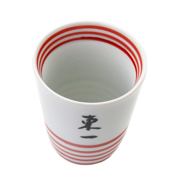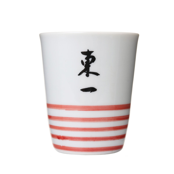 佐賀県の代表的なやきもの・有田焼と同様、400年の歴史を誇る肥前吉田焼でつくられた「東一」ロゴ入りぐい呑みです。線はすべて手描きのため、色の濃淡や太さが少しづつ異なり、そこに手作りならではのやさしさや親しみやすさが感じられます。サイズ:口径6.5mm × 高さ8mm