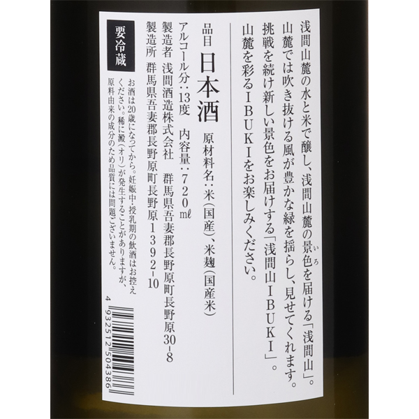 「浅間山IBUKI」は浅間山に吹く風を表現しました。原料は全て浅間山麓のものにこだわり、日々の食卓や様々な食事に愉しんでいただけるような日本酒として設計された商品です。出来る限り皆様の感性でお楽しみいただけるように原料米や精米歩合、日本酒度などをアルコール度数以外の情報を非公開といたしました。浅間山シリーズの中でも新しい景色をお届けするために挑戦を続ける一品です。受賞歴