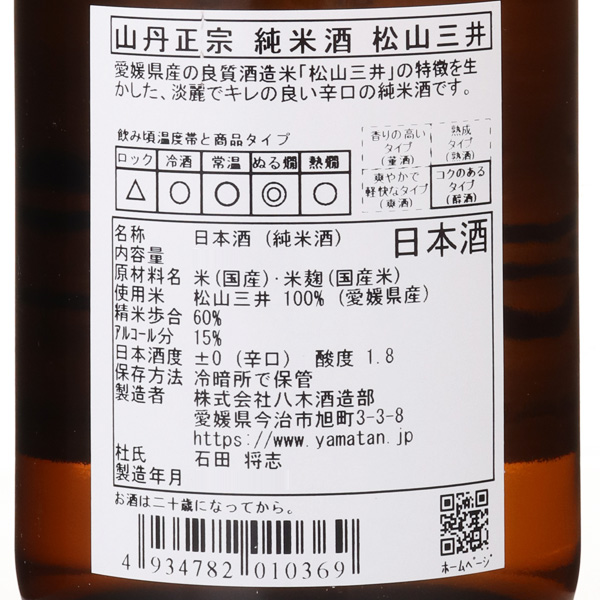 愛媛県産 松山三井を使用し、米の旨味をじっくり引き出しました。スパッとキレの良い辛口の食中酒です。飲むほどに体に馴染んでくる、飲み飽きしない純米酒です。冷酒から熱燗まで、お好みの温度帯でお楽しみください。受賞歴