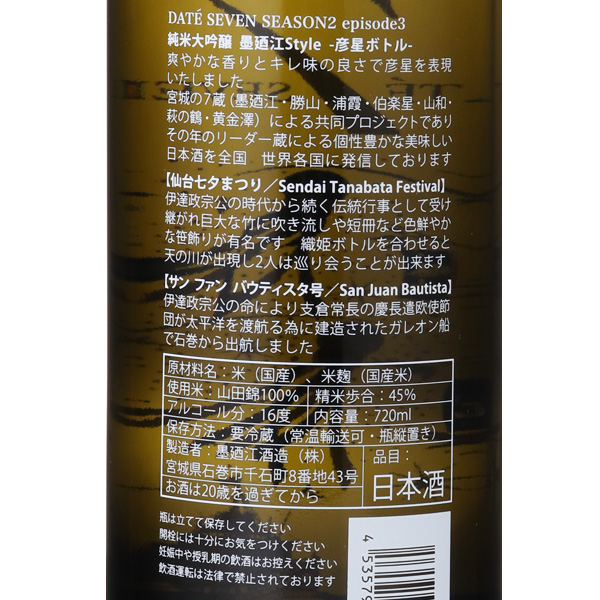 「DATE SEVEN」は、宮城の7蔵(勝山・浦霞・墨廼江・伯楽星・山和・萩の鶴・黄金澤)による共同醸造プロジェクト。技術交流を図り切磋琢磨しながら、酒質を更に磨き上げます。「SEASON2」ではふたつのリーダー蔵が同じ原料米と精米歩合の同スペックで仕込み、蔵元の個性を活かした美味しさを表現しました。同スペックで仕込むことにより、リーダー蔵はおのずと競い合い、品質向上に励みながら自社の酒造りを追求します。今回のリーダー蔵は、「墨廼江酒造/墨廼江」 「仙台伊澤家 勝山酒造/勝山」高品質な宮城県産酒を全国に、そして世界へと発信していきます。