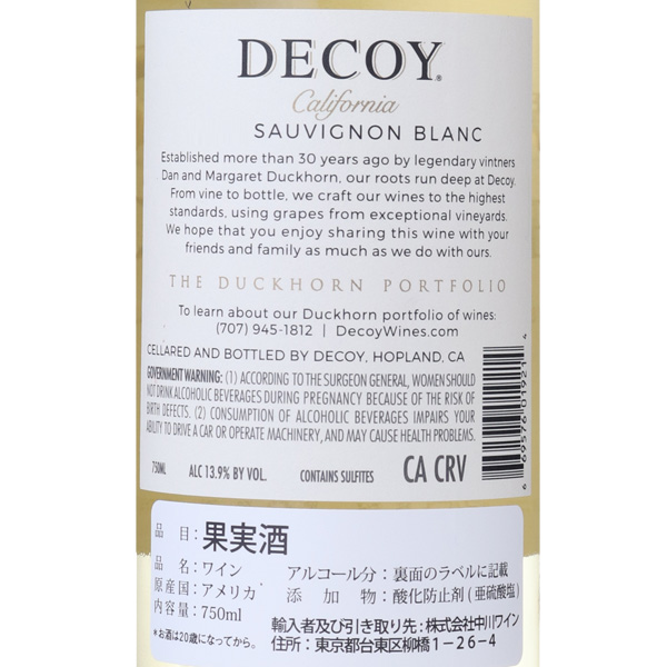 ダックホーン・ヴィンヤーズはナパ・ヴァレーでソーヴィニヨン・ブランを1982年から造っています。このデコイ ソーヴィニヨン・ブランはその長い経験を生かし、この品種の魅力を違う角度から表現してみようと、カリフォルニアの他の有名な生産地の葡萄を使用し造られました。ラシアン・リヴァー・ヴァレー北部のやや暖かい地区の畑を中心に、モントレー、レイク、 メンドシーノ からカリフォルニアらしい味わいに仕上げられています。20年近く作り続け定番商品となっているダックホーンのソーヴィニヨンブランをお手本にしながら、こちらは樽を一切使用せず、レモン果皮や草の香りを強く残しました。バランスよく清々しいフィニッシュです。グースベリー、パッションフルーツ、スイート・ライム、そしてマンゴーの魅惑的な引き込むようなアロマを持つ、鮮やかで活き活きとしたソーヴィニヨン・ブラン。口中では素晴らしいミネラルが柑橘やトロピカル・フルーツの果実味を支え、長く爽快なフィニッシュへと導きます。