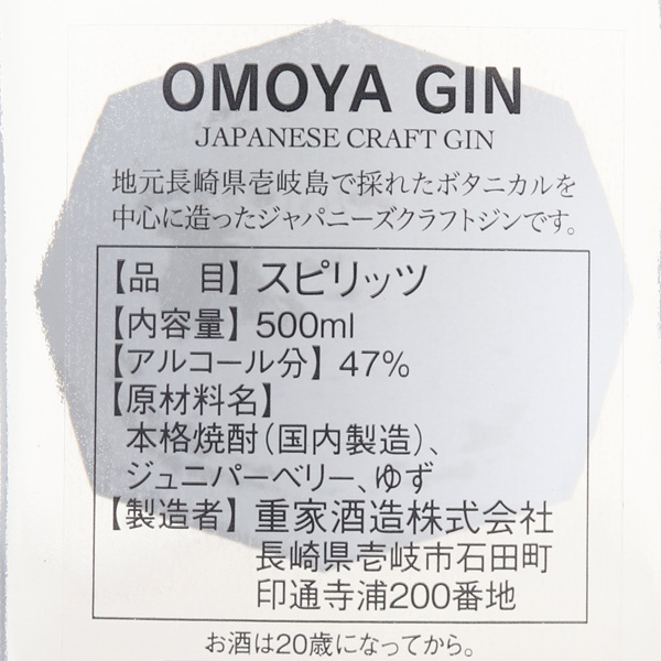 麦焼酎発祥の地である壱岐で造った壱岐麦焼酎をベースにジュニパーベリーと柚子皮を漬け込み蒸留したジンです。東京農大研究室と70種類以上の試作を繰り返し、1年近くに及ぶ試行錯誤の末に完成しました。ジュニパーベリーはもちろんのこと、柚子の風味が特徴的な仕上がりです。ジン1に対して、炭酸水4程度の割合でシンプルにお楽しみいただくのがお勧めです。アルコール度数47度にすることにより、カクテルベースとしても使用することができます。