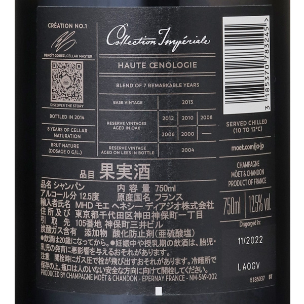 最高醸造責任者、ブノワ・ゴエズの卓越した最新鋭の技と、メゾンのオート エノロジーを表現すべく制作された新しいプレステージ シャンパンコレクション アンペリアルは、傑出した7種類のヴィンテージのアッサンブラージュで、それぞれの品質を高めるために厳選され、異なる環境で熟成されました。ステンレスタンクで熟成させたフレッシュな2013年から始まり、オーク樽で熟成させたヴィンテージの洗練された2012年、力強い2010年、凛とした味わいの2008年、フルボディの2006年、生き生きとした2000年、そして二次発酵後に澱とともに瓶内熟成させたエレガントな2004年で締めくくられます。ワインの選別、熟成、ブレンドの技術を駆使し、ドザージュを行っていません。コレクション アンペリアルは、ブリュット ナチュール シャンパンとして、ピュアな風味を表現しています。