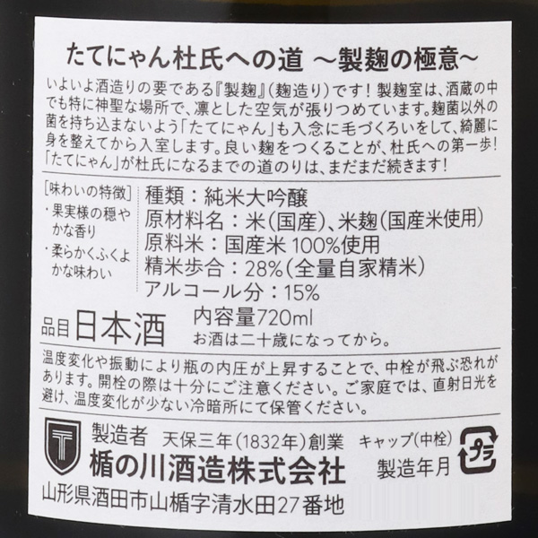 楯野川 純米大吟醸 たてにゃん 杜氏への道 製麹の極意