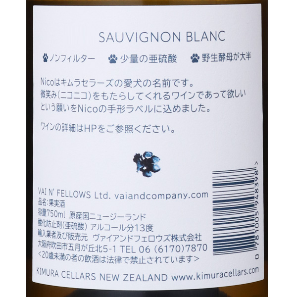 キムラセラーズのフラッグシップ「ソーヴィニヨン・ブラン」を、「より自然な造り」で仕上げた新しいキュヴェ。NICOシリーズの名前の由来は、キムラセラーズの愛犬「ニコ」から。微笑み(ニコニコ)をもたらしてくれるワインであって欲しいという願いがNicoの手形ラベルに込められています。ノンフィルター、少量の亜硫酸、野生酵母が大半。洋ナシ、グレープフルーツ、レモン、白い花な どの爽やかな香りに、やさしいフルーツの風味、 エレガントでありながらも骨格のしっかりした重厚感のある味わいです。