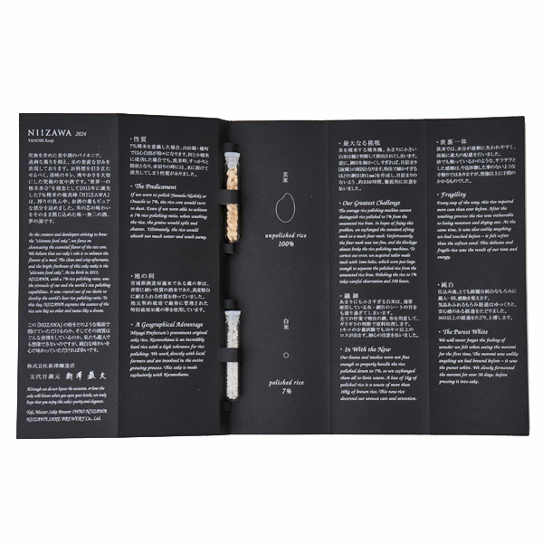 現代アートとのコラボレーション日本酒として2015年に発売。以来、毎年様々なアーティストとコラボレーションしています。高度精米になると麹の製造が極端に難しくなり、麹由来の旨味を引き出しにくくなるのですが、NIIZAWAについては、同じ7%精米である「残響Super7」の2倍程度の米の旨味を引き出すことに成功した、技術溢れる1本となっています。米の甘みをダイレクトに感じることができ、常に余韻が長く、じっくりとお楽しみいただけます。冷蔵庫で保管することにより、綺麗に熟成していきます。「”世界一の精米”をお届けする」という指針からスタートした7%精米シリーズの最高峰に位置するお酒で、年間1000本限定の貴重な1本です。2024年ラベルエチケット :ヤノベ ケンジ(YANOBE KENJI)