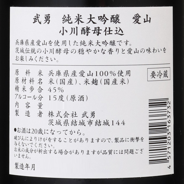 兵庫県産 愛山を使用し、茨城伝統の明利小川酵母を合わせた純米大吟醸。穏やかながらマスカット様の華やかな香りと、愛山らしい膨らみのある上品な甘味、柔らかい酸とほろ苦さが全体を引き締め、余韻までまろやかさが広がります。蔵紹介