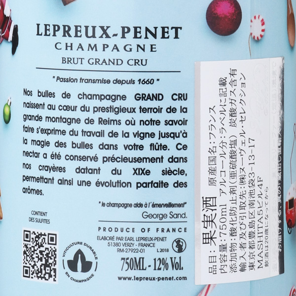 「ノエル」はフランス語でクリスマス。見ているだけでわくわくする特別仕様のクリスマスデザインです。これまでは中身がプルミエクリュでしたが、新たに「グラン・クリュ」にランクアップ!クリスマスにピッタリの限定作品が、素敵なホリデーシーズンの乾杯をより一層楽しく彩ります。ピノ・ノワール2/3、シャルドネ1/3。いずれもグラン・クリュのヴェルジー産50%、ヴェルズネイ産50%。ステンレスタンクで醸造、3年間ビン熟成しました。ドザージュは8g/l。キュヴェは通常輸入していない、この生産者のスタンダード・ブリュットになります。