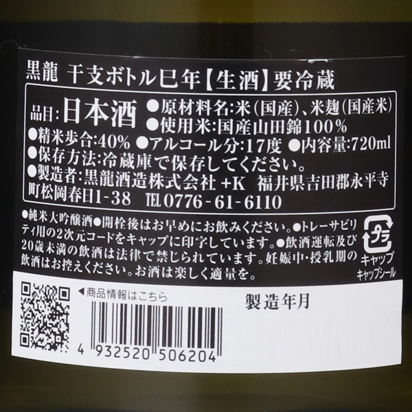 黒龍 純米大吟醸 生原酒 干支ボトル 巳年