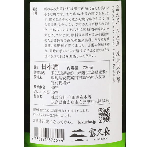 口当たりは柔らかで、旨味たっぷりなのに見事なまでスカッと切れるあと口のよさは、八反草ならでは。ポテンシャルを最大限に引き出した富久長のフラッグシップといえる銘柄です。直汲み原酒を1本ずつ丁寧に瓶火入れ、瓶貯蔵しているので、搾りたてのフレッシュな風味を保っています。蔵紹介