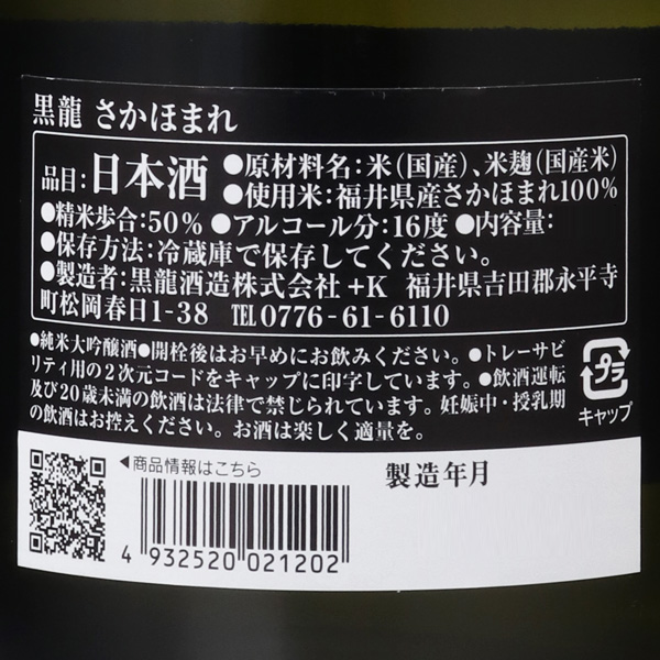 福井生まれの酒米「さかほまれ」を使用した、冬の黒龍。華やかな甘みをまとった香り、マスカットの様な爽やかな甘味、柑橘系のスッキリとした酸味、全てがバランス良くまとまり、澄んだ空気のような透明感と「さかほまれ」由来の上品な旨味が特長の季節限定酒です。生牡蠣やアクアパッツァなど、さっぱりしたお料理に合わせてお楽しみください。注意事項