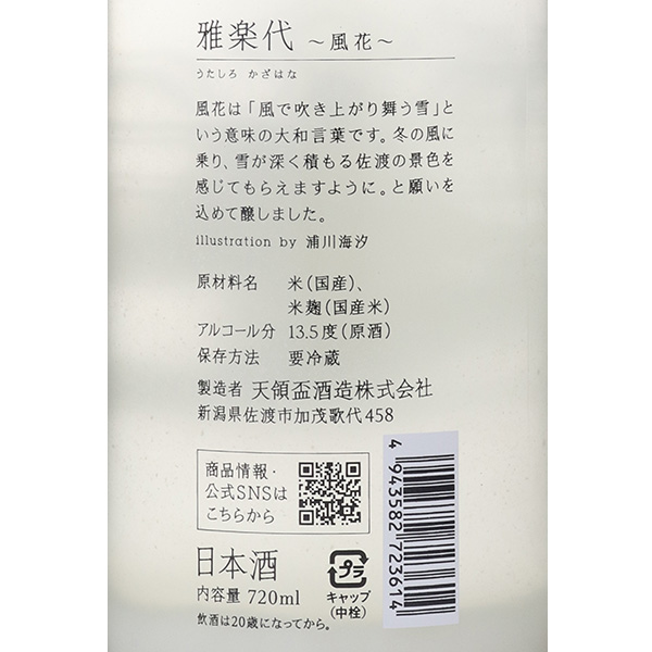 今回は、地元佐渡産の一本〆を使った、初めての活性にごりにチャレンジ!きめ細かいガス感と、オリによるまろやかさ、柔らかさが心地よく、軽快な酸とほろ苦さが全体をひとつに引き締めます。雅楽代らしく、軽快で淡麗ドライに仕上げられた活性にごりです。撹拌すると苦味渋みをほのかに感じ、普段の雅楽代シリーズよりは甘みを感じ、アフターは軽やかに流れていきます。ラベルは蔵人でもあり漫画家の卵であるペンネーム浦川海汐さんがデザインしています。冬の雪が降り積もる佐渡で順徳天皇(雅楽代の由来)が佇んでいる様子に、活性にごりならではのシュワシュワ感が演出されています。