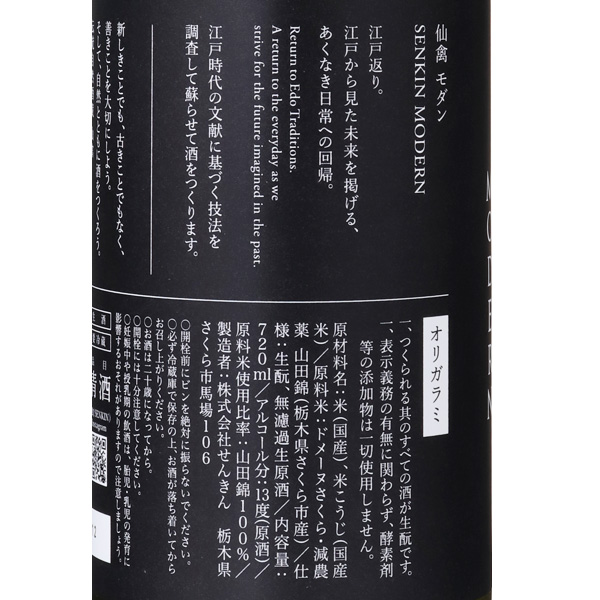 江戸返り。江戸から見た未来を掲げる、あくなき日常への回帰。後世に残すべき江戸時代の酒造法「生もと」を尊重し、守り、進化させながら仙禽流にモダナイズ。江戸返りをテーマに【農業】【技法】【思想】に焦点を合わせたブランドです。
