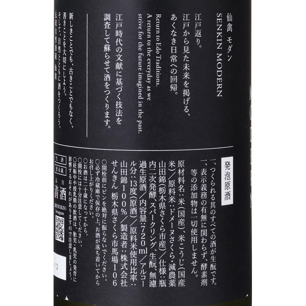 江戸返り。江戸から見た未来を掲げる、あくなき日常への回帰。後世に残すべき江戸時代の酒造法「生もと」を尊重し、守り、進化させながら仙禽隆にモダナイズ。江戸返りをテーマに【農業】【技法】【思想】に焦点を合わせた新ブランドです。新生モダンは全量生もと造りとなり、全てのモダンを集結。搾りたてをそのまま瓶詰めした一本です。参式は発泡原酒を指します。