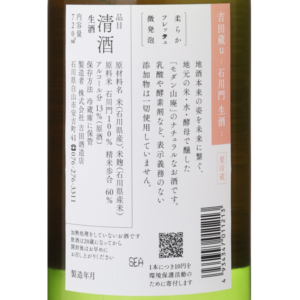 食、人、自然に寄り添うナチュラルで優しい吉田蔵u。繊細で扱いの難しい石川県の酒米「石川門」をとことん研究し、乳酸や発酵助剤、酵素剤など表示義務のない添加物を一切使わず、米と水と酵母のみを使用したオリジナルレシピ「モダン山廃」で醸しました。