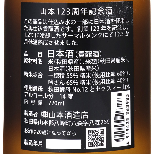 山本酒造店123周年記念酒!山本ワンツースリー!第1弾創業123周年を記念し、1.2度に冷却したサーマルタンクにて、12.3ヶ月低温熟成させました。3段仕込みの留め仕込みに「山本 ピュアブラック」を使用し再仕込みした貴醸酒です。甘さはそれほど強くなく、さらりとした酸がきれいに流れていきます。新政酒造で不要になった瓶を貰い、瓶詰めするという、何ともSDGsな取り組みをされているそうです。