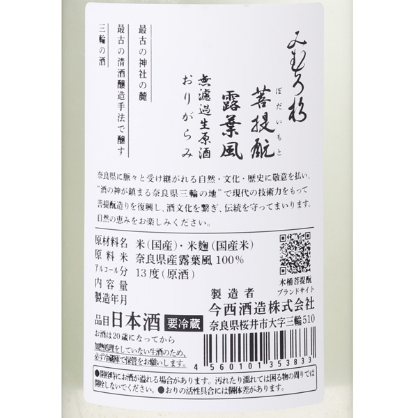 みむろ杉 菩提もとシリーズ、菩提もとの入門編!みむろ杉ろまんシリーズの醸造技術を応用し、木桶ではなく、通常使用しているサーマルタンクで醸した菩提もと酒です。アルコール度数は原酒13度と軽く設計していますが、超自然派の「菩提もと」造りは重層的な味わいを演出し、軽やかながらも豊かな旨味を感じる液体へと昇華させてくれました。