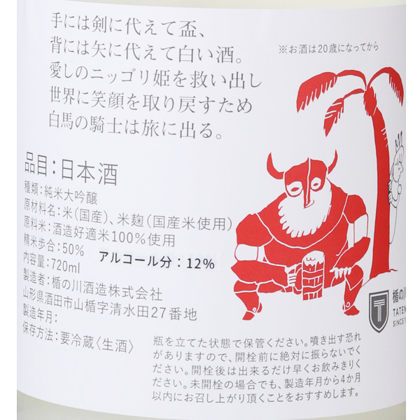 新発売!「白馬の騎士」?にごり酒で新たな冒険を!「日本酒離れの救世主となって欲しい」という願いを込めてお届けする一本、その名も「白馬の騎士」。手に剣ではなく盃を、背には矢ではなく白い酒を携え、愛するニッゴリ姫を救い出し、笑顔あふれる世界を取り戻すべく旅に出る「白馬の騎士」の物語。そんな冒険譚を描くような、遊び心あふれる一本です。ぜひこの機会に、「白馬の騎士」とともに新たな日本酒の楽しみ方をお試しください。楯野川が届ける「白馬の騎士」の冒険が、皆さまの日々に笑顔をもたらしますように。